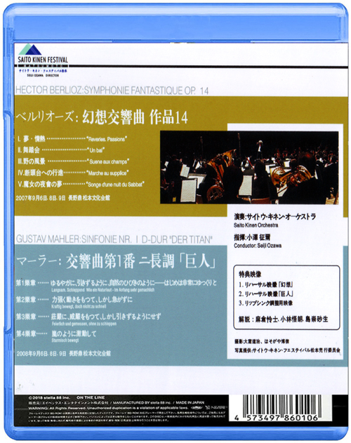 幻想交响曲 作品14号 第一乐章:梦幻、热情 第二乐章:舞会 第三乐章:田野景色 第四乐章:赴刑进行曲 第五乐章:妖魔夜宴之梦 交响曲第1番二长调“巨人” 第一乐章:缓慢而沉重地 第二乐章:强而有力的 第三乐章:庄重而威严地 第四乐章:如狂飆般激动地 Saito Kinen Orchestra & Seiji Ozawa Year: 2007/2008 Genre:: Classical Conductor: Seiji Ozawa Cast: Saito Kinen Orchestra Description: Blu-ray features "Symphonie fantastique Op. 14" performed in 2007, and "Symphonie Nr. 1 D-dur Der Titan" performed in 2008. Special Features: rehearsal hootage, and more (22 minutes approx.) Louis Hector Berlioz: Symphonie fantastique, Op.14 1. Passion Dream 2. Ball 3. View of the field 4. March to the guillotine 5. Soiree dream of a witch Gustav Mahler: Sinfonie Nr.2. 1 D-Dur "Der Titan" 1. Slowly, dragged, like the sound of nature - very slowly at first 2. With a strong move, but hurry 3. The solemn, with dignity, but not as Hikizuru 4. As the turbulent storm 所有评价(0)