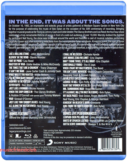 蓝光影碟必须要用蓝光影碟机或用PS5才能播放 其它设备一律不能播放. 1992年傳奇民謠歌手巴布狄倫錄音生涯30周年致敬演唱會 1. Like a Rolling Stone - John Mellencamp 2. Blowin’ in the Wind - Stevie Wonder 3. Foot of Pride - Lou Reed 4. Masters of War - Eddie Vedder & Mike McCready 5. The Times They Are a-Changin’ - Tracy Chapman 6. It Ain’t Me Babe - June Carter Cash & Johnny Cash 7. What Was It You Wanted - Willie Nelson 8. I’ll Be Your Baby Tonight - Kris Kristofferson 9. Highway 61 Revisited - Johnny Winter 10. Seven Days - Ron Wood 11. Just Like a Woman - Richie Havens 12. When the Ship Comes In - The Clancy Brothers and Robbie O’Connell with special guest Tommy Makem 13. War - Sinead O’Connor 14. Just Like Tom Thumb’s Blues - Neil Young 15. All Along the Watchtower - Neil Young 16. I Shall Be Released - Chrissie Hynde 17. Love Minus Zero/No Limit - Eric Clapton 18. Don’t Think Twice, It’s All Right - Eric Clapton 19. Emotionally Yours - The O’Jays 20. When I Paint My Masterpiece - The Band 21. You Ain’t Goin’ Nowhere - Mary-Chapin Carpenter, Rosanne Cash & Shawn Colvin 22. Absolutely Sweet Marie - George Harrison 23. License to Kill - Tom Petty & the Heartbreakers 24. Rainy Day Women #12 & 35 - Tom Petty & the Heartbreakers 25. Mr. Tambourine Man - Roger McGuinn 26. It’s Alright, Ma (I’m Only Bleeding) - Bob Dylan 27. My Back Pages - Bob Dylan, Roger McGuinn, Tom Petty, Neil Young, Eric Clapton & George Harrison 28. Knockin’ on Heaven’s Door – Everyone 29. Girl of the North Country - Bob Dylan Bonus Feature: Behind the Scenes (Running time: 39 minutes) Bonus Live Performances (not in HD): 1. Leopard-skin Pill-box Hat - John Mellencamp 2. Boots of Spanish Leather - Nancy Griffith with Carolyn Hester 3. Gotta Serve Somebody – Booker T. & the M.G.’s 所有评价(0)