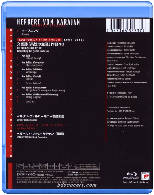 Herbert von Karajan: R. Strauss: Ein Heldenleben Blu-rayJapan カラヤンの遺産 R. シュトラウス:交響詩「英雄の生涯」 Berlin Philharmonic (1985) 01. Opening 02. Ein Heldenleben Op.40 Tondichtung Fur Grosses Orchester Der Held 03. Ein Heldenleben Op.40 Tondichtung Fur Grosses Orchester Des Helden Widersacher 04. Ein Heldenleben Op.40 Tondichtung Fur Grosses Orchester Des Helden Gefahrtin 05. Ein Heldenleben Op.40 Tondichtung Fur Grosses Orchester Des Helden Walstatt 06. Ein Heldenleben Op.40 Tondichtung Fur Grosses Orchester Des Helden Walstatt 07. Ein Heldenleben Op.40 Tondichtung Fur Grosses Orchester Des Helden Friedenswerke 08. Ein Heldenleben Op.40 Tondichtung Fur Grosses Orchester Des Helden Weltflucht Und Vollendung 09. Ein Heldenleben Op.40 Tondichtung Fur Grosses Orchester Des Helden Weltflucht Und Vollendung Video Codec: MPEG-4 AVC Resolution: 1080i (upconverted) Original aspect ratio: 1.33:1 Audio Music: LPCM 2.0 Subtitles None Discs Blu-ray Disc