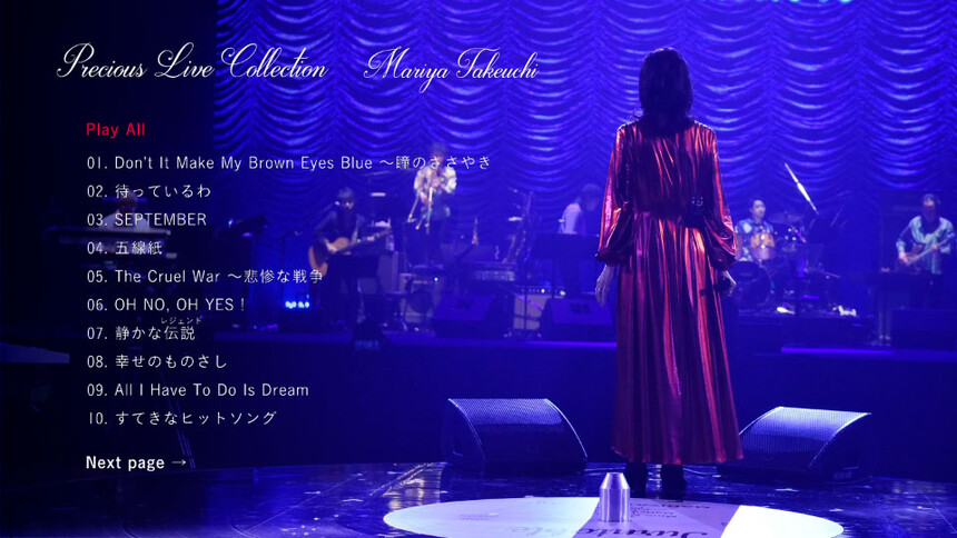 【Precious Live Collection】 <収録曲> 1. 瞳のささやき ※「LIVE Turntable」より 2. 待っているわ ※「LIVE Turntable」より 3. September ※「LIVE Turntable」より 4. 五線紙 ※「LIVE Turntable」より 5. 悲惨な戦争 ※「LIVE Turntable」より 6. Oh No, Oh Yes! ※「LIVE Turntable」より 7. 静かな伝説 ※「LIVE Turntable」より 8. 幸せのものさし ※「LIVE Turntable」より 9. All I Have To Do Is Dream ※「LIVE Turntable」より 10. すてきなヒットソング ※「LIVE Turntable」より 11. 家に帰ろう ※「LIVE Turntable Plus」より Space Shower Sweet Love Shower 2012 12. 元気を出して ※Space Shower Sweet Love Shower 2012 初映像化 13. みんなひとり ※「LIVE Turntable Plus」より souvenir again mariya takeuchi live 2010 14. プラスティック・ラブ ※「LIVE Turntable Plus」より souvenir 2014 15. 駅 ※「LIVE Turntable Plus」より souvenir 2014 16. 人生の扉 ※「LIVE Turntable Plus」より souvenir again mariya takeuchi live 2010 17. いのちの歌 ※「LIVE Turntable Plus」より souvenir 2014 所有评价(0)