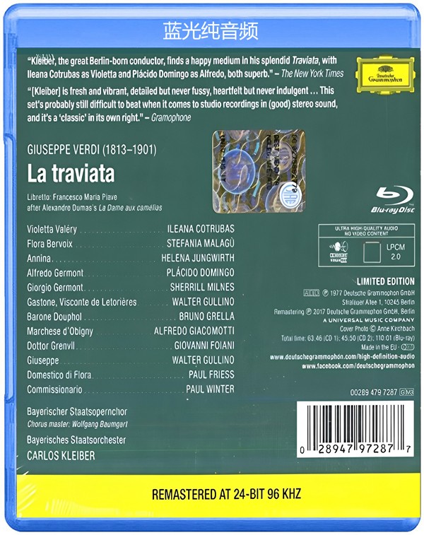这张是蓝光纯音频: 沒有影像 Pure Audio Blu-ray LPCM 24bit/96kHz Carlos Kleiber La Traviata 1976 所有评价(0)