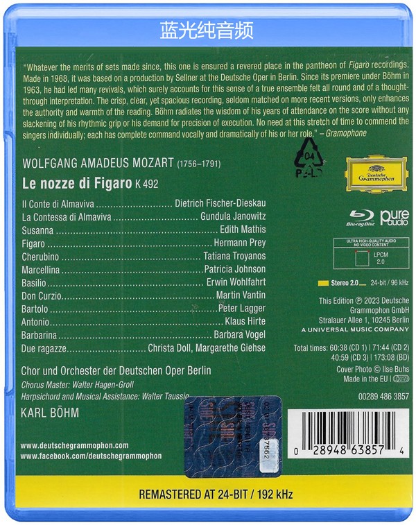 Pure Audio Blu-ray LPCM 24bit/96kHz Mozart: Le nozze di Figaro, K492 1967 Blu-ray Audio 所有评价(0)